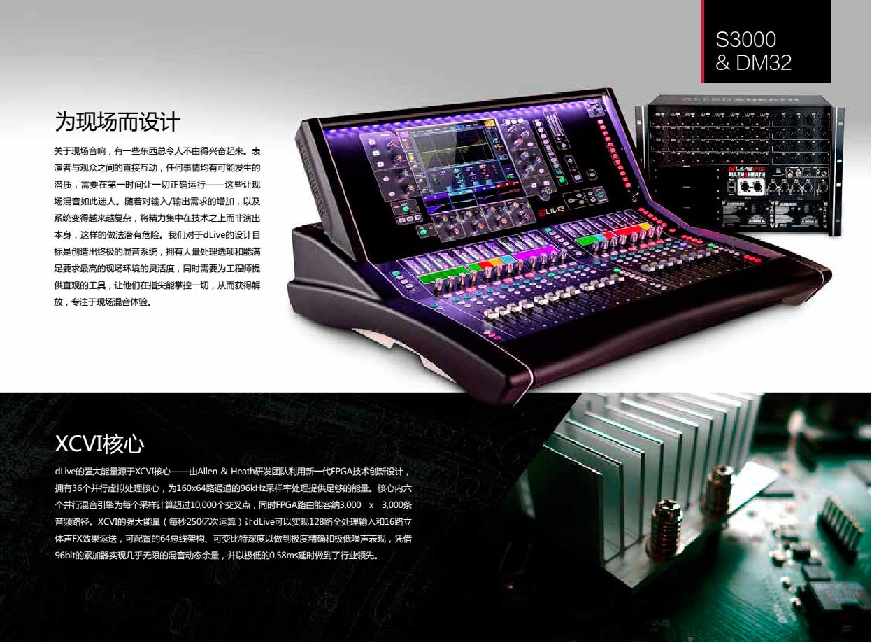 dLive的強(qiáng)大能量源于XCVI核心——由Allen & Heath研發(fā)團(tuán)隊(duì)利用新一代FPGA技術(shù)創(chuàng)新設(shè)計(jì),擁有36個并行虛擬處理核心,為160x64路通道的96kHz采樣率處理提供足夠的能量。核心內(nèi)六個并行混音引擎為每個采樣計(jì)算超過10,000個交叉點(diǎn),同時FPGA路由能容納3,000 x 3,000條音頻路徑。XCVI的強(qiáng)大能量(每秒250億次運(yùn)算)讓dLive可以實(shí)現(xiàn)128路全處理輸入和16組立體聲FX效果返送,可配置的64總線架構(gòu)、可變比特深度以做到極度精確和極低噪聲表現(xiàn),憑借96bit的累加器實(shí)現(xiàn)幾乎無限的混音動態(tài)余量,并以極低的0.6ms延時做到了行業(yè)領(lǐng)先。
