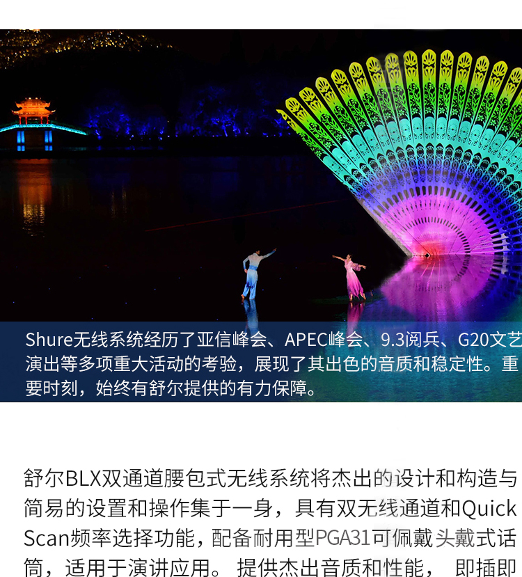 舒爾BLX無(wú)線系統(tǒng)不僅能夠提供專業(yè)品質(zhì)的音效,并且安裝簡(jiǎn)易,界面直觀,即插即用,品質(zhì)優(yōu)異。其設(shè)計(jì)精密,有手持式、領(lǐng)夾式、樂器和頭戴式等多種配置可選,是舞臺(tái)上的絕佳之選。BLX標(biāo)準(zhǔn)版配備帶PG話筒頭的單通道和雙通道系統(tǒng)。
