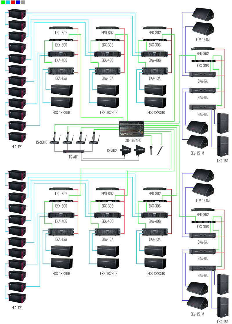 我司為大型戶外演出提供如下音響系統擴聲解決方案,本套擴聲方案選用了高度智能化、集成化的產品,建立了開放式的架構系統,在實際應用上既滿足了系統管理維護使用的便捷性,又保持了系統能夠較長時間工作的穩定性。在現場舞臺產品搭配上發言單元選用得勝高品質真分集無線話筒TS-9310搭配TS-AD系列天線放大系統,遠距離無損耗拾取人聲;擴聲單元配備了得勝ELA線性陣列音箱以及ELV系列,EKS系列全頻、超低音、返聽揚聲器,加上XR-1824多通道調音臺,外接EKX-306高精度處理器、EQ-3102處理器等周邊設備,組成了一整套能夠最大程度上提升現場演出震撼感與舞臺魅力的大型戶外擴聲系統。